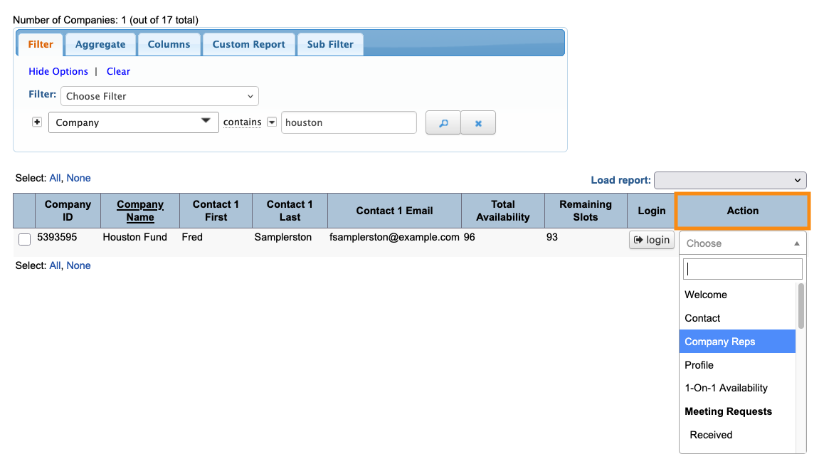 Filter the list to locate the Company you need. Then use the Action menu to choose Company Reps:
