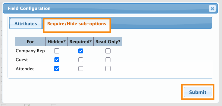 - Use the checkboxes to make this field Hidden for Attendees and Guests, but Required for Company Reps:
