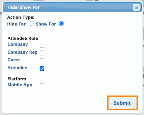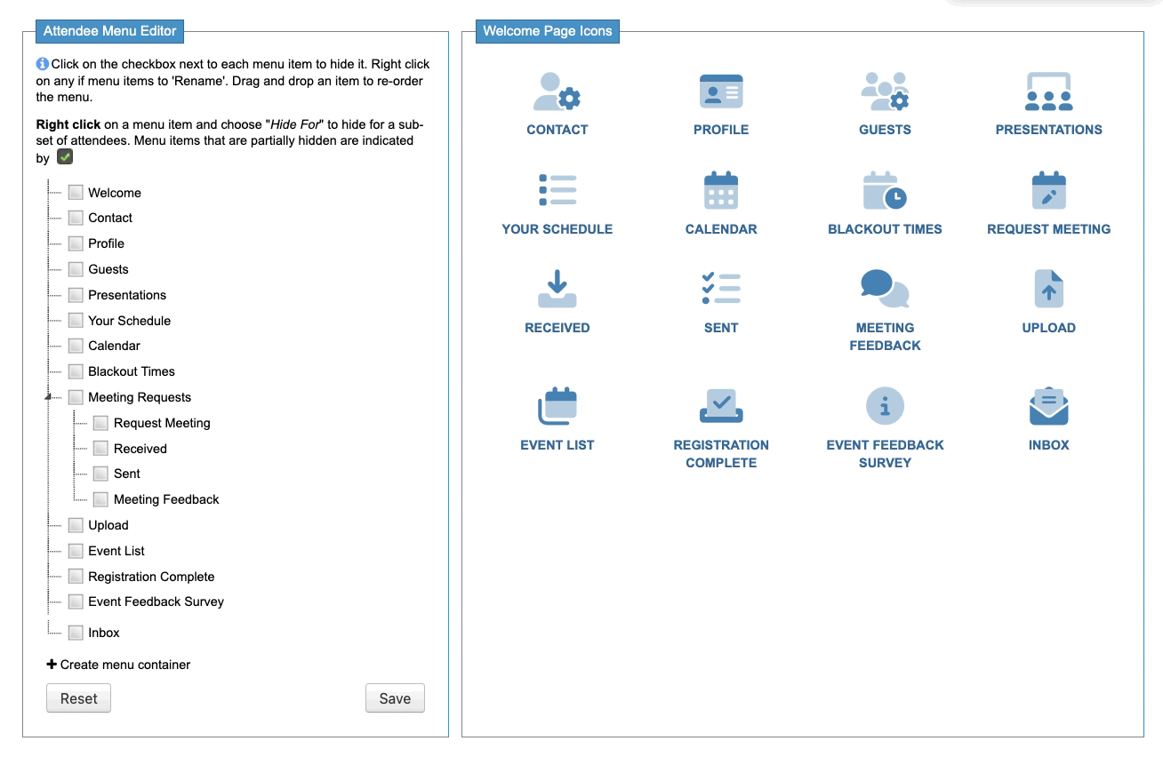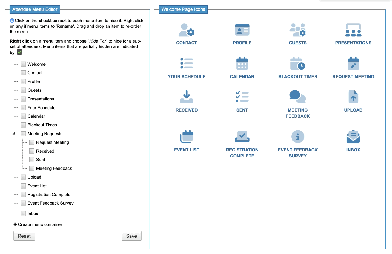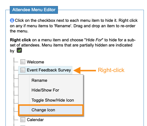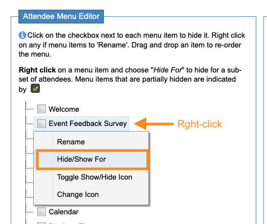 We’re working with the Attendee menu here. If you want to show or hide a page for Companies, choose the Company Menu Editor instead. - Step 2. In the Menu Editor, you’ll see your Custom Page. (In this example, ours is titled Event Feedback Survey.)