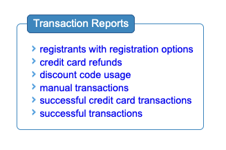 The Transaction Reports page is designed to be a handy link list, where you can quickly access reports from different areas of MeetMax: