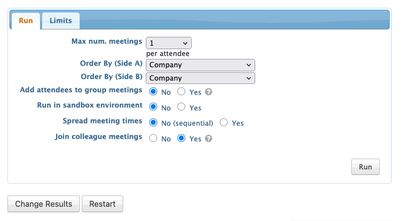 Finally, you might also want to use the Limits tab. This is where you control how many meetings MeetMax can create.