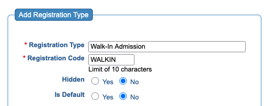 - • Is Default: If you want a Registration Type to be pre-selected on the registration form, choose Yes here.