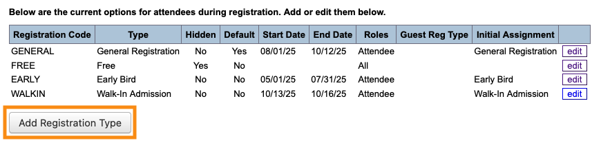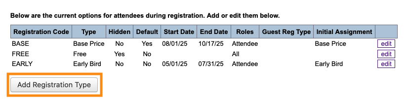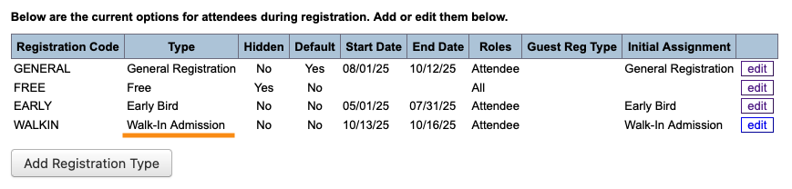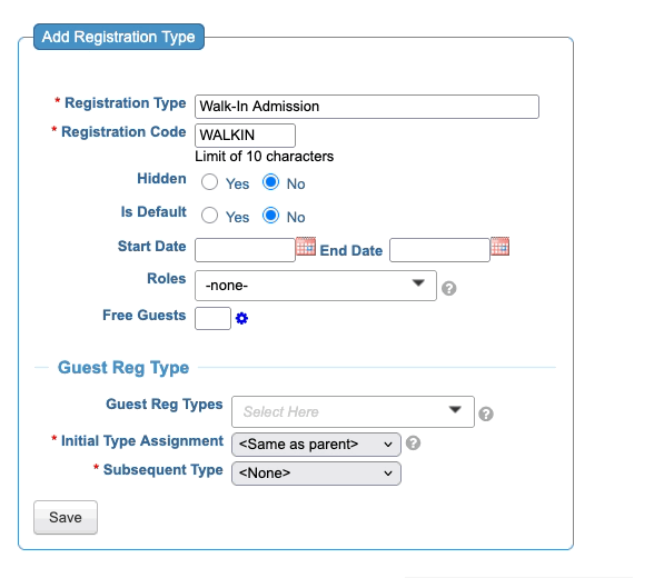 - Registration Types are the admission tickets your participants choose when they register. Common examples are Early Bird or General Admission.