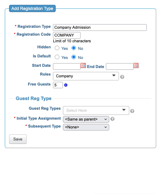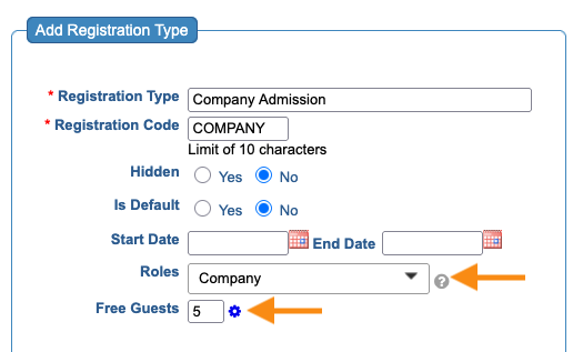- Step 2. Fill in the fields you need. In our example, we’ll assign this new Registration Type only to Companies. And in the Free Guests field, we’ll enter the included 5 guests: